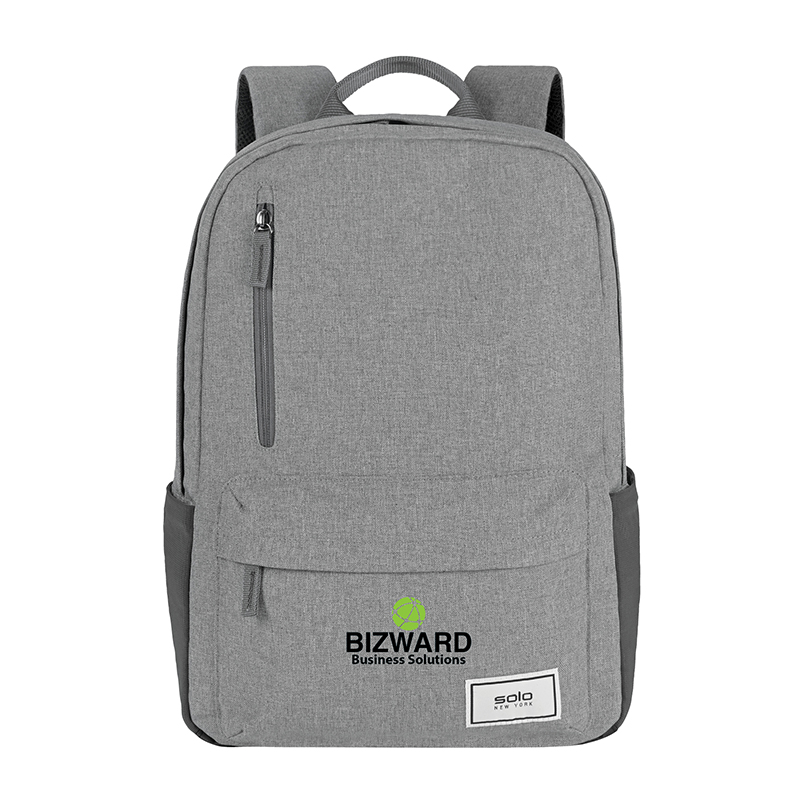 The Solo New York Re:cycled Collection presents the Re:cover Backpack made from a heathered grey material created with 5 recycled PET bottles. This backpack has a fully padded main compartment with black camo lining and a padded pocket large enough to hold most 15.6″ laptops. With two front zippered pockets, 2 side stretch-mesh water bottle pockets, and fully padded backside and adjustable straps, wear this backpack when on-the-go and carry your essentials in comfort and style. The Re:cover Back. Complies with Prop 65. 11 1/4″ W x 14 3/4″ H x 7″ D