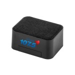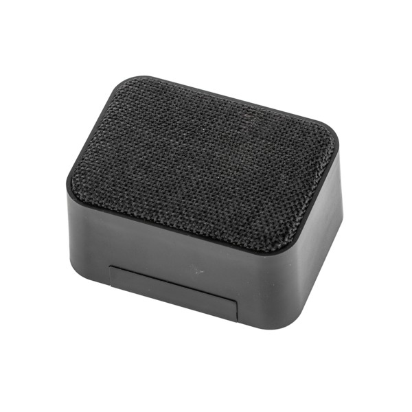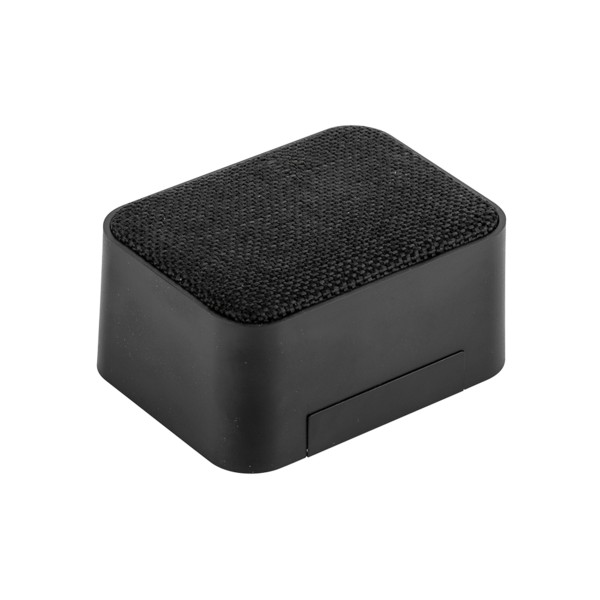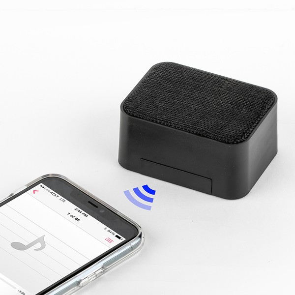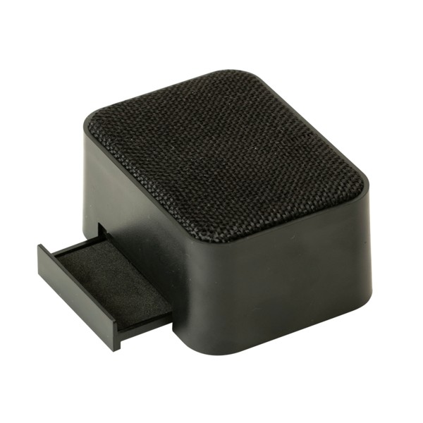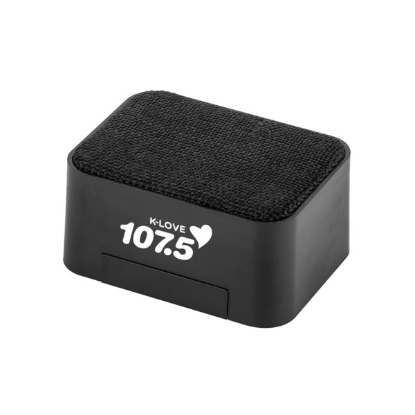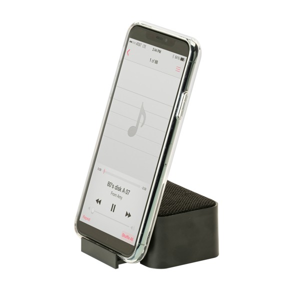 Rechargeable wireless fabric speaker and phone stand. On/off switch panel on back; pull out stand for phones; playtime: approx. 1.5 hours; USB charging cable included. 2.375″ D x 1.6875″ H x 3.25″ W