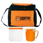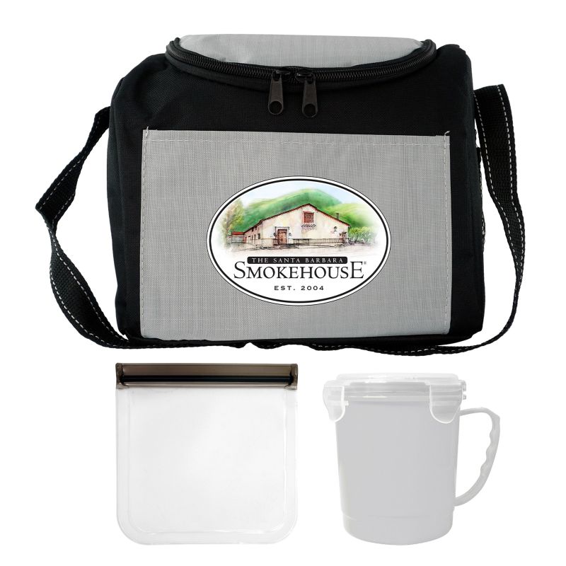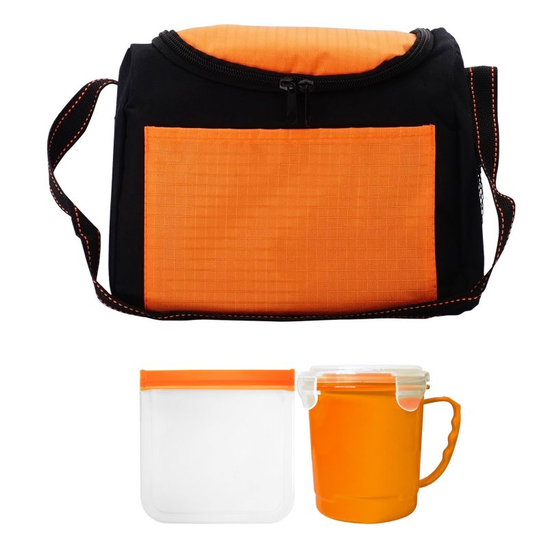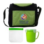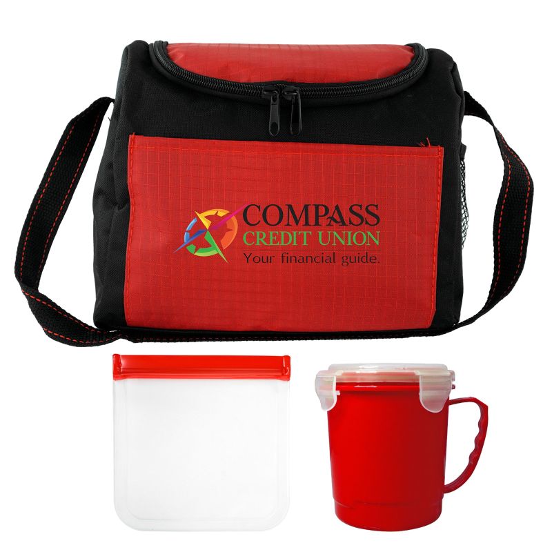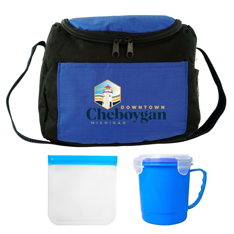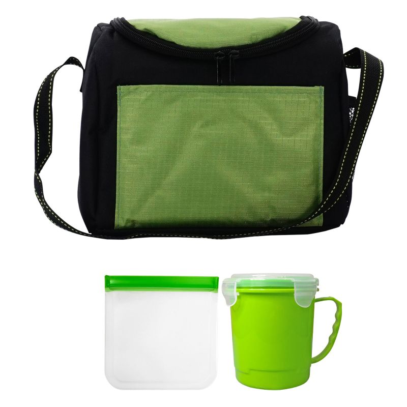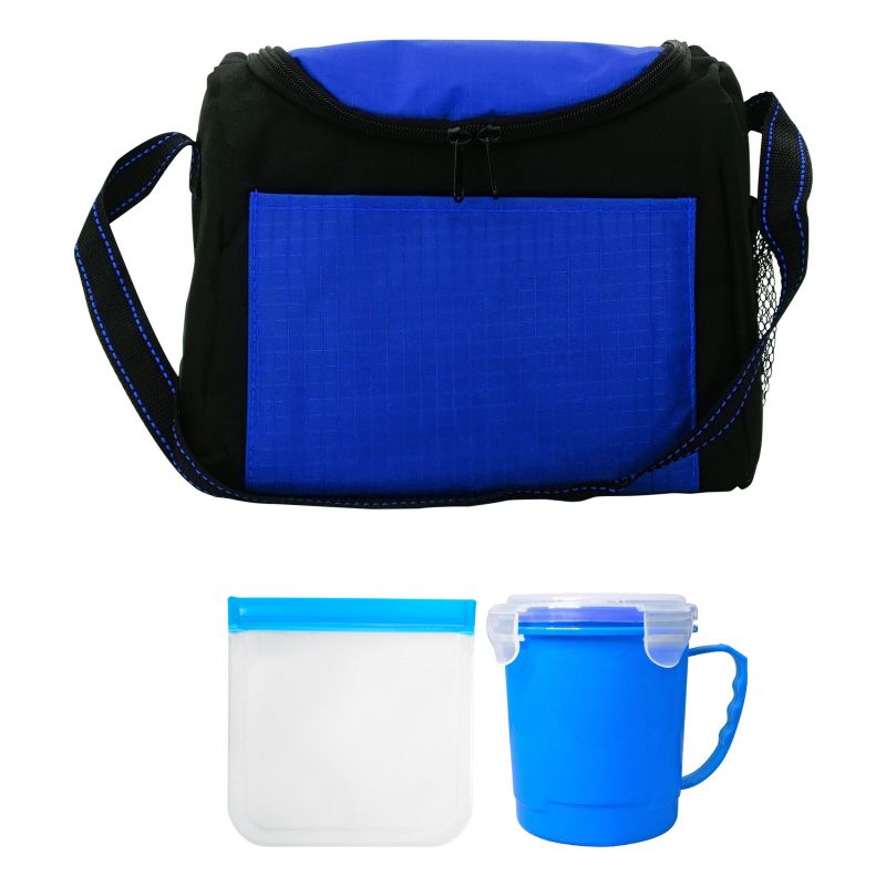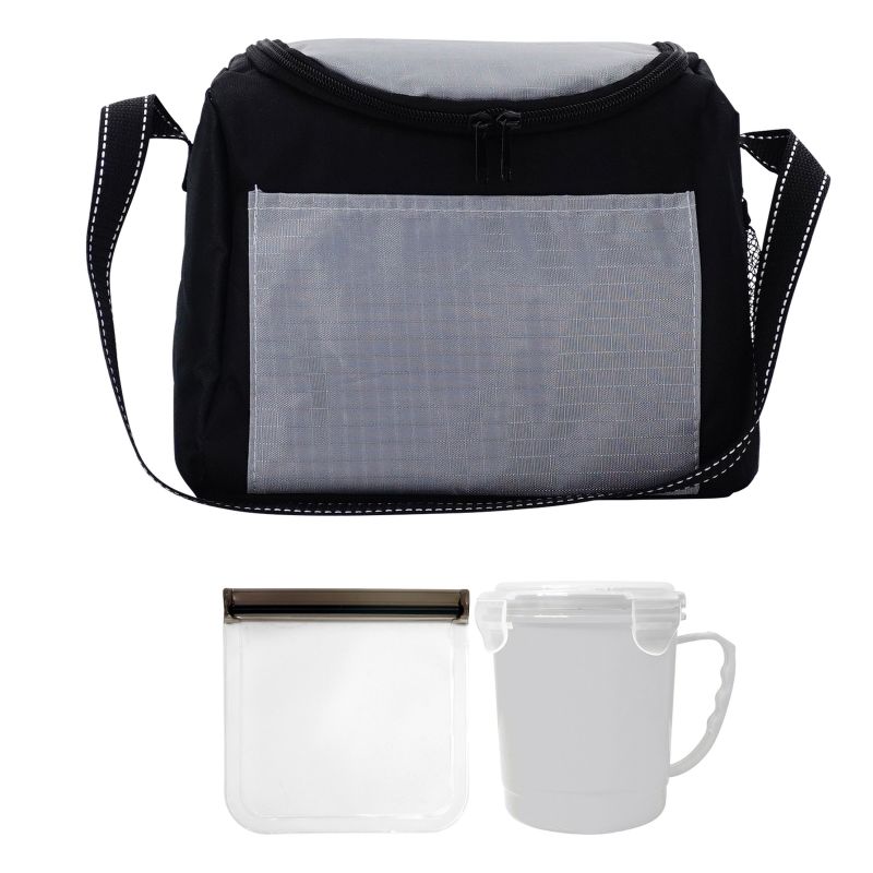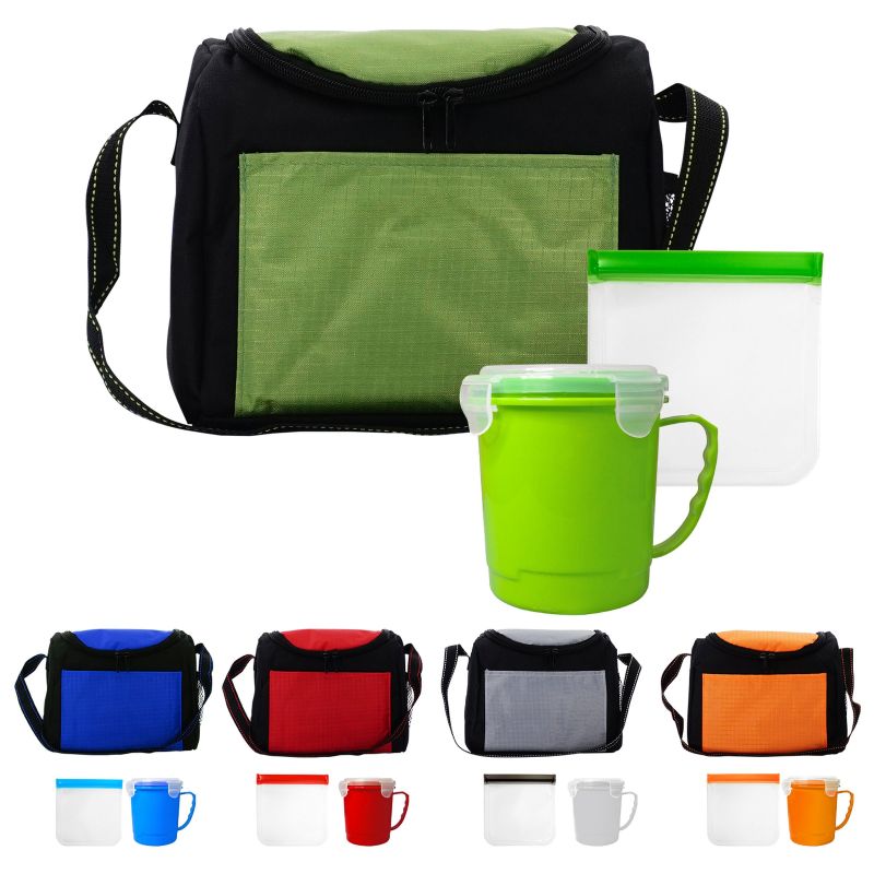 Put-Lunch-on-Ice Bag with pocket for freezer pack. Soup Mug with handle. Reusable Sandwich Bag with zip closure. Embroidery and imprint on additional items available, see Terms & Conditions. This item qualifies for Dim Weight; Please call or email for freight quote. Complies with FDA, Prop 65. 9″ L x 8″ W x 7.5″ H