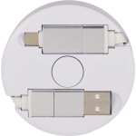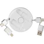 The Spinner 5-in-1 40W PD Charging Cable can be extended to 36” long and includes a USB Type-A adapter and a USB Type-C input tip on one side. The other side includes a two-in-one dual compatible adapter for both Apple iOS and Android devices (up to 9V/2A, 18W charging speed), a USB Type-C output tip. Compatible for iPhone 15 Series, Android phones with Type-C port, even iPads/tablets with Type-C port. By using Type-C to Type-C type with appropriate AC adapter, it can reach up to 20V/2A, 40W. I. 2.56″ D x 2.56″ W x 0.87″ H