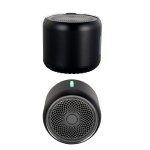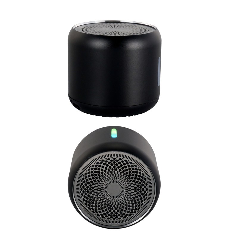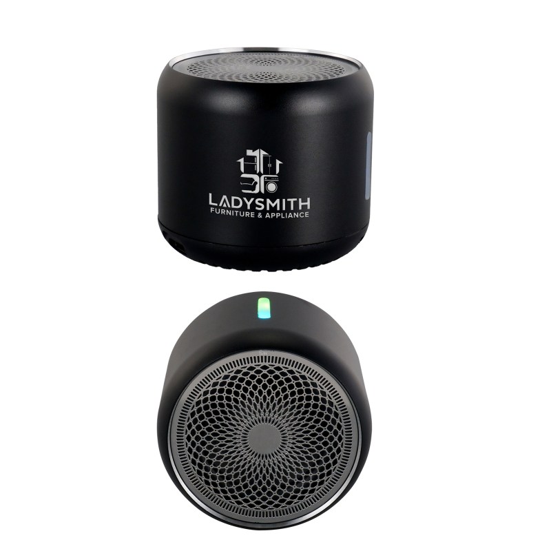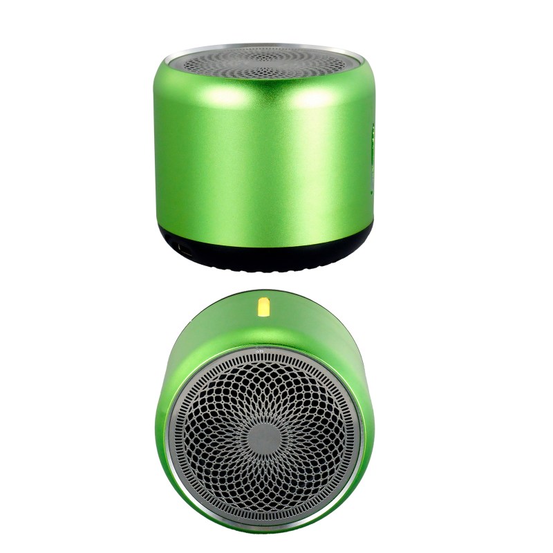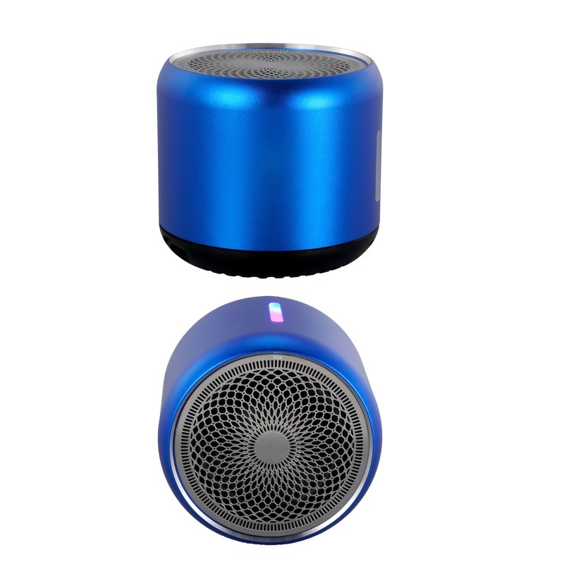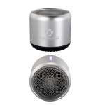 Round metal Bluetooth speaker connects to most Bluetooth devices, Two of these speakers can pair with each other for stereo effect, Includes USB charging cable and rechargeable battery. Complies with Prop 65. 2″ D x 2″ H