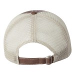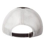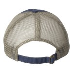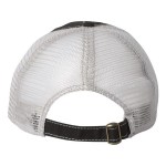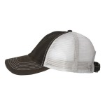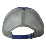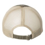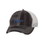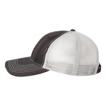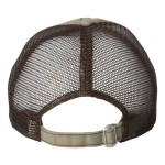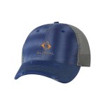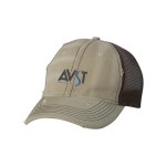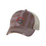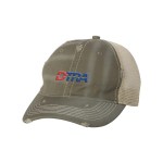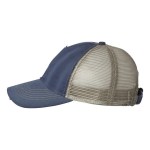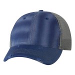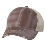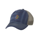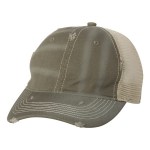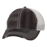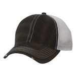100% cotton dirty bio-washed chino twill front and 100% washed polyester mesh back six-panel cap. Unstructured and low-profile with sewn eyelets, pre-curved visor, and matching undervisor. Distressed visor and crown. Adjustable self-fabric back with tri-glide buckle. 4″H x 25″ circumference.