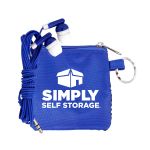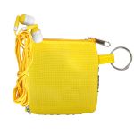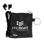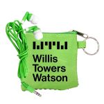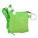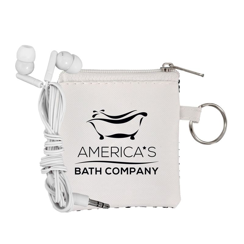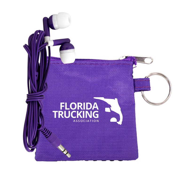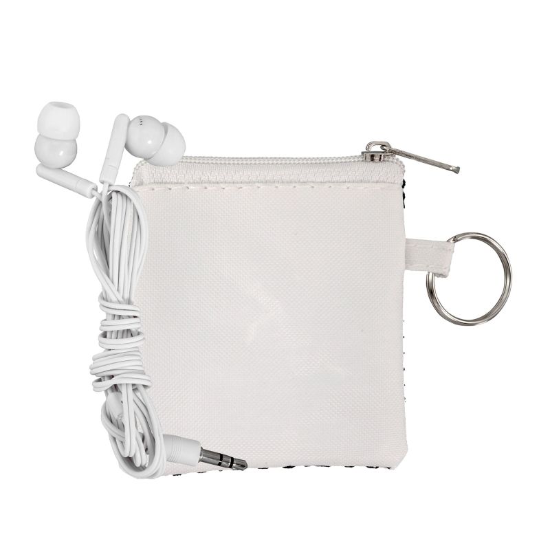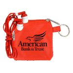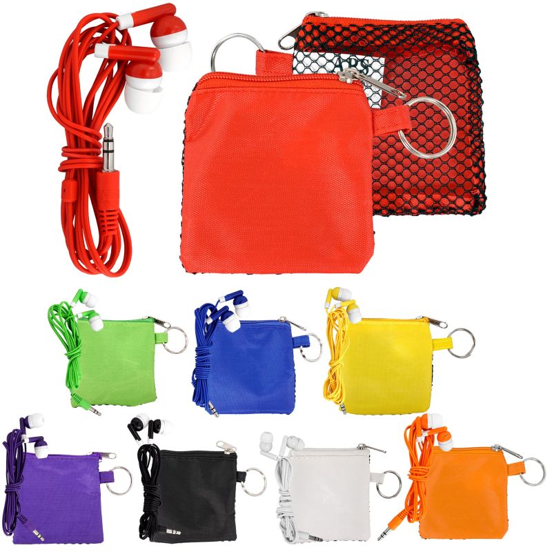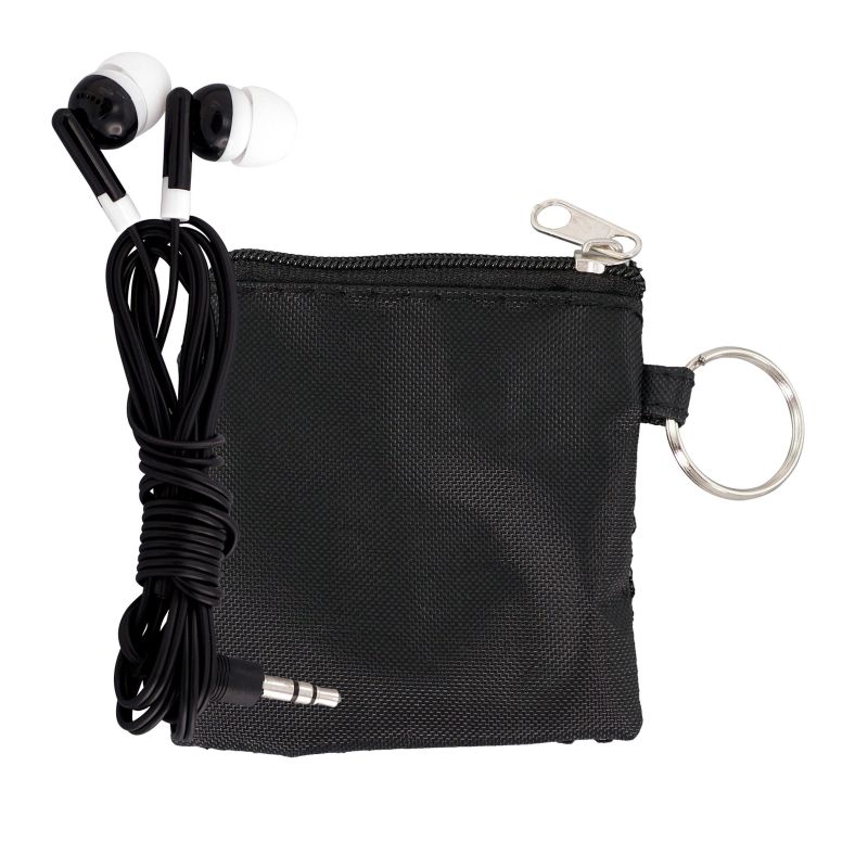 Smooth fabric and Black mesh travel pouch with keyring; Patented. Color matching ear buds inside. Complies with Prop 65. 2.75″ L x 2.75″ H