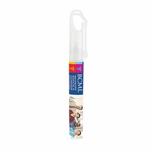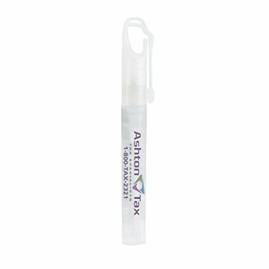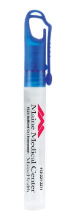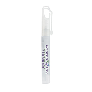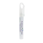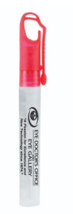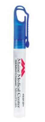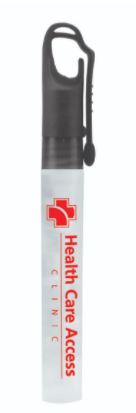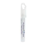 This pump bottle antibacterial sanitizer spray is designed with a special clip cap to easily go on your belt loop, bag, back pack or any carrying case. The top of the cap has a loop designed for easy lanyard attachment as well. Contains 10ml/.34 oz of citrus scented anti bacterial spray. Meets FDA Standards. All sanitizer bottles include ingredient label on reverse side. Material: Polypropylene Plastic. 5/8″ W x 5 1/4″ H