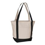 This medium-weight cotton-canvas tote features a zippered top closure and a convenient slip pocket between its handles. Easily carry it over your shoulder using the 28″ long 2-ply handles that add a pop of color that matches the bottom-accent design feature. This sturdy reusable bag will become a favorite helper on trips to the library, outings to the farmers market, or visits to the grocery store. 20″ W x 16″ H x 6″ D