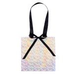 The Star™ Iridescent Eurotote is made from 157 GSM iridescent-silver paper with a color-shifting, reflective finish, paired with black grosgrain ribbon handles and a black ribbon-tie closure. Bottom board included. 6.5″ W x 6.5″ H x 3.5″ D
