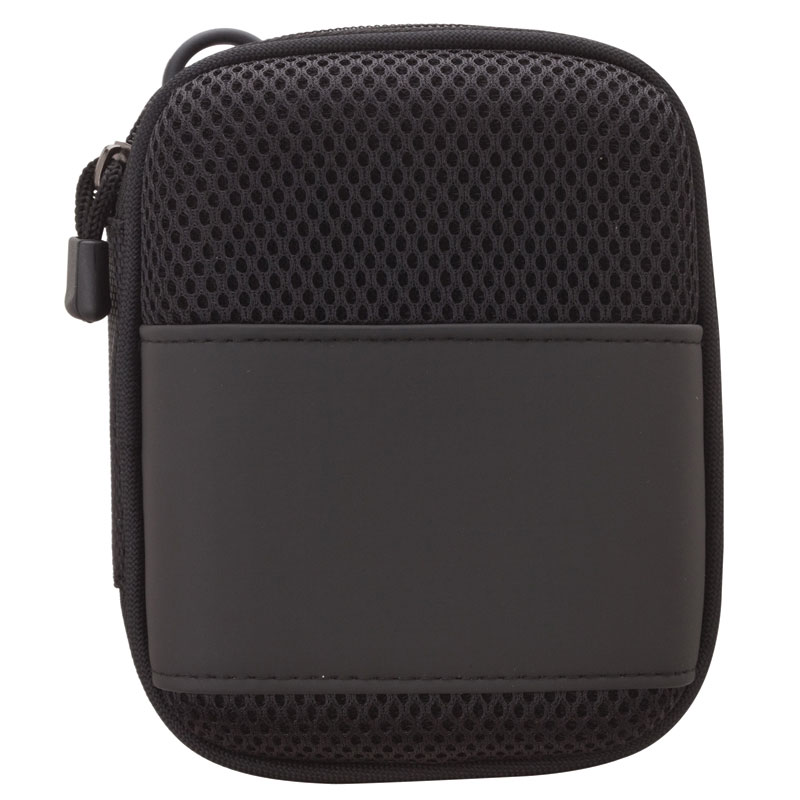 Portable stereo speaker, zip vinyl case, adjustable shoulder strap, carabiner. Includes 2 x AA batteries. Complies with Prop 65. 5″ W x 6″ H
