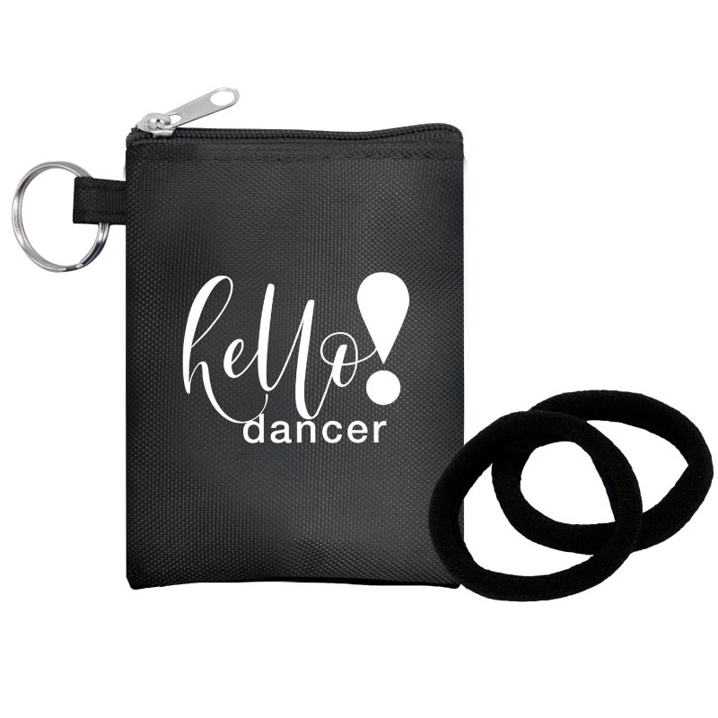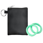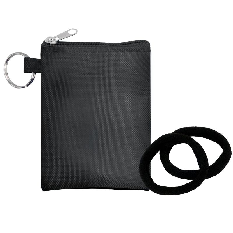 Polyester pouch with stretchy Black lycra back and keyring. Two colorful hair ties. Complies with Prop 65. 3″ L x 3.75″ H