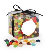 Perfect for a table favor or thank-you gift, our clear acetate cube comes packed with one-half pound of world-famous Jelly Belly® Jelly Beans. Your recipients can’t help but smile at the cheerful colors and delicious flavors! Your logo or message is included on a four-color label affixed to the front of the cube. For the perfect finishing touch, we wrap the cube with a black raffia ribbon and bow. Complies with CPSIA, FDA, Prop 65. 3″ L x 3″ W x 3″ H