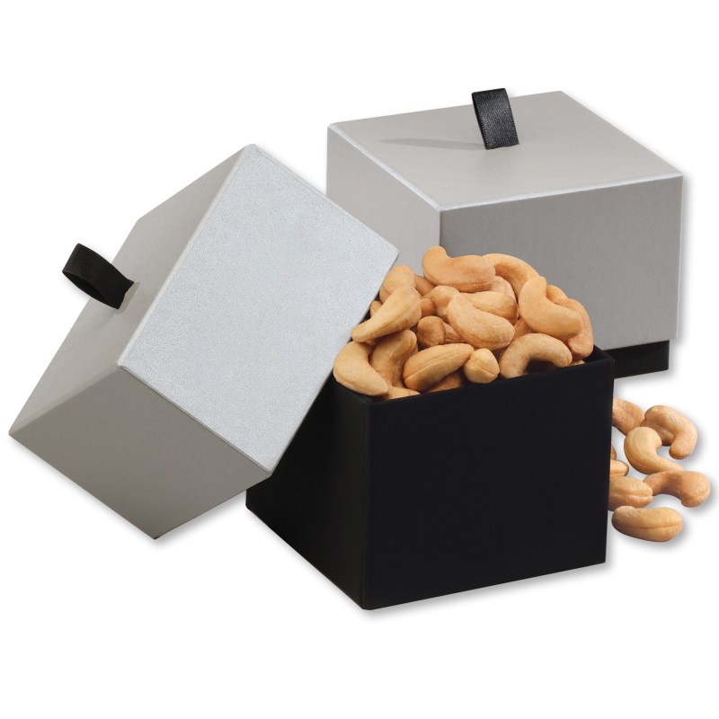 When your recipients pull the grosgrain tab to lift the lid of these unassuming boxes, they’ll be delighted by what is revealed! We foil-stamp your logo in your choice of color on the side of the silver lid, then fill it with fresh-roasted fancy cashews, five-ounces. The charming box is handy for storing small items long after the treats have been enjoyed, providing a lasting reminder of your regard. Complies with CPSIA, FDA, Prop 65. 3.8125″ L x 3.8125″ W x 3.0625″ H