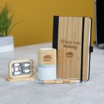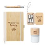 The Sustainable Sync Onboarding Set blends eco-friendly materials with modern tech essentials to keep new hires connected and organized. It includes the Forleo Bamboo Notebook and matching Bamboo Pen with Stylus for everyday notes, a stylish Wireless Speaker – Bamboo Multi Color for work or leisure, and a Multi-Functional Charging Cable Kit to power devices on the go. Perfect for companies committed to sustainability and innovation, this set makes a thoughtful, functional first impression.