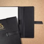 The Swiss Force® Attila Hardcover Journal w/ Belt combines modern function with a sleek leatherette cover and a secure wraparound belt closure. Inside, the refillable journal includes two card slots and a built-in pen holder for effortless organization on the go. Durable, polished, and practical, it’s an ideal companion for meetings, travel, and daily note-taking.Product Features:- Leatherette cover – 128 lined sheets- Built-in pen holder- Card slots & organization pocket- Refillable journal*Promo Page Inserts Optional. See Decorating Info for details. 5.75″ W x 8.75″ H
