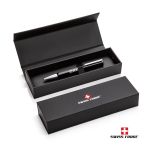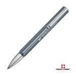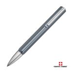 High polished, metallic twist action pen, with modern triangular design. Includes a black tin gift box with foam inserts.