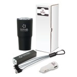 The Systems 4-Piece Technology Gift Set has essential tech items packaged together in a customized gift box. Use the aluminum-cased mobile power bank with rechargeable 1900mAh litium ion battery to charge your phone when you’re out and about or in the office. Power bank input: 5V / 1000 mA, output: 5V / 1000 mA; UL Certified, and BC (California Energy Commission), and FCC VOC certified. You can charge your phone in the car with the twin port shared 2A USB car charger powered by a car lighter socket and use the 3-in-1 charging cable set that has micro USB, 5 pin lightning and type C connectors as well as a convenient aluminum carabiner to charge your other tech devices. The Systems gift set also includes a 20 oz. double walled stainless steel, vacuum sealed tumbler with copper lining. This tumbler has a sleek design and is convenient to take to work or use in the car. Send this gift set to your tech-loving friends and employees. Ground shipment only. Complies with Prop 65. 3 1/2″ W x 7 1/16″ H x 3 1/2″ D