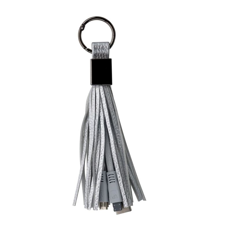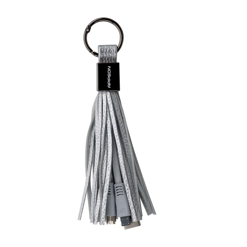 Decorative tassel 3-in-1 charging cable keyring; Multiple USB adaptor. Compatible with 8-pin devices, Micro USB; Type C USB; Patented. Apple® is a registered trademark of Apple, Inc.,. Complies with Prop 65. 5.25″ L x 0.475″ H