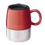 Modern ceramic coffee mug- New and improved shape perfect for the office- Stylish porcelain ceramic desk mug- Easy push-on, seamless lid- Stainless steel ring- Cushioned base. 5.0″ W x 5.5″ H