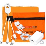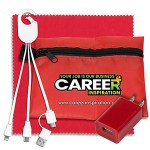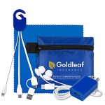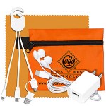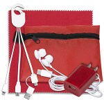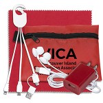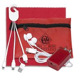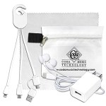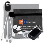 Tech kit comes 3 Device Cleaning Wipes and with the following unimprinted items: #5088 6″ x 6″ Microfiber Cleaning Cloth, #5140 Charging Cables, #5127 UL Listed USB Wall Charger, and Type C White Headphone Earphones. Item #5140 5-in-1 Charging Cable with 5 pin attachment for use with Apple ® devices, Micro USB attachment & Type-C connector, both to use with current Android® & Apple ® devices. Apple iPhone® and Apple ® are a registered trademarks of the Apple ® corporation. 5″ W x 4 1/4″ H