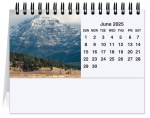 Tent desk calendar with a glossy full color cover sheet and 12 month-on- a-page calendar sheets with gloss text and room to write. Back of the last sheet has a year-on-a-page calendar for the current year and the next year. Calendar in black only. 5 13/16″ W x 4 1/2″ H