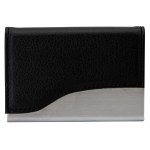 Steel business card case with curved leatherette magnetic hinged cover. Complies with Prop 65. 3 5/8″ W x 2 1/2″ H x 5/8″ D