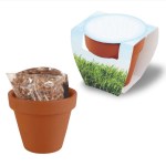 Celebrate Earth Day or any other day with a green and eco-friendly message with the Seed Sensations Terracotta pot planter. This 2.25″ terracotta pot has a classic round design and contains a packet of soil and seeds. Simply remove the seeds from the packet, plant under a layer of good soil (provided), water daily and watch your seedlings sprout. Germination takes between one and three weeks, with full instructions included on the pre-printed sleeve. Comes with your choice of Clover, Forget-Me-Not or Sunflower seeds, please specify when ordering, otherwise, a random assortment will be used. 2.25″ H x 2.25″ W