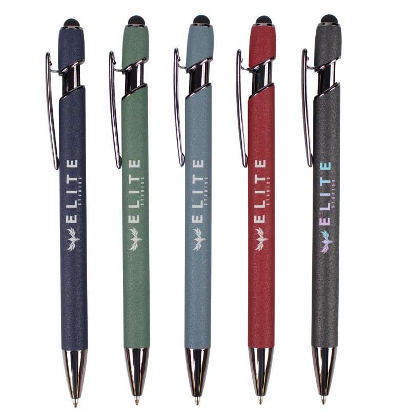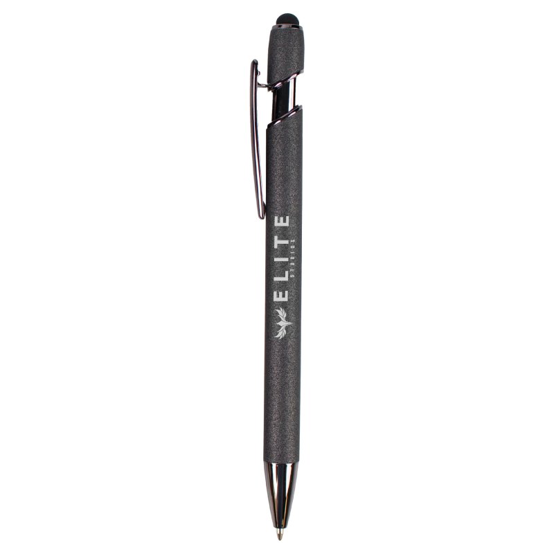 The Textari Rainier pen offers sophistication with its soft-touch executive stylus design in dappled earth tones & sleek gunmetal trim. Featuring smooth black ink & a handy stylus for increased connectivity, it ensures an exceptional writing experience while keeping your message top of mind with its generous imprint area. Complies with Prop 65. 5.6″ L x 0.39″ Diameter