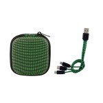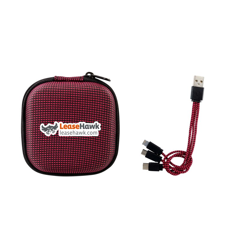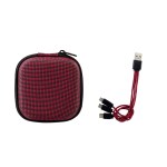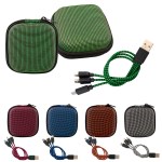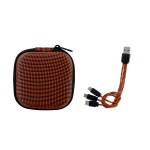 Molded textured case with zipper closure. Braided 3-in-1 charging cable; Multiple USB adaptor. Compatible with 8-pin devices, Micro USB, Mini USB; Patented. Compatible with ios devices. Complies with Prop 65. 3.25″ L x 3.25″ H x 1.25″ W