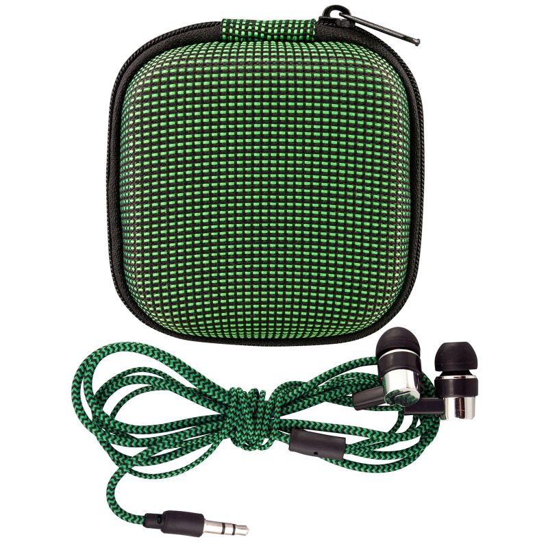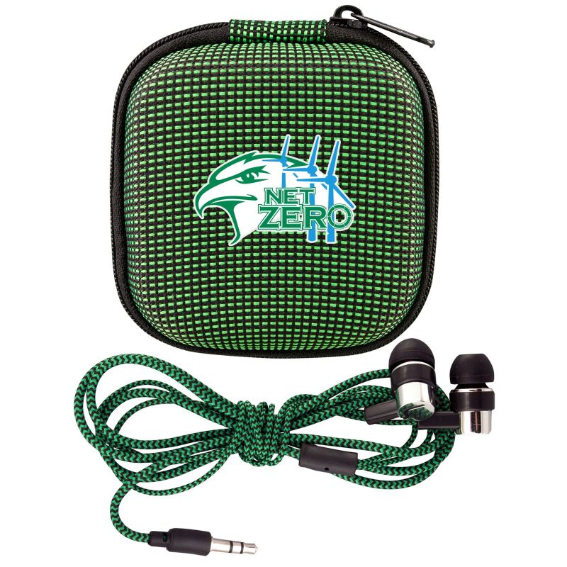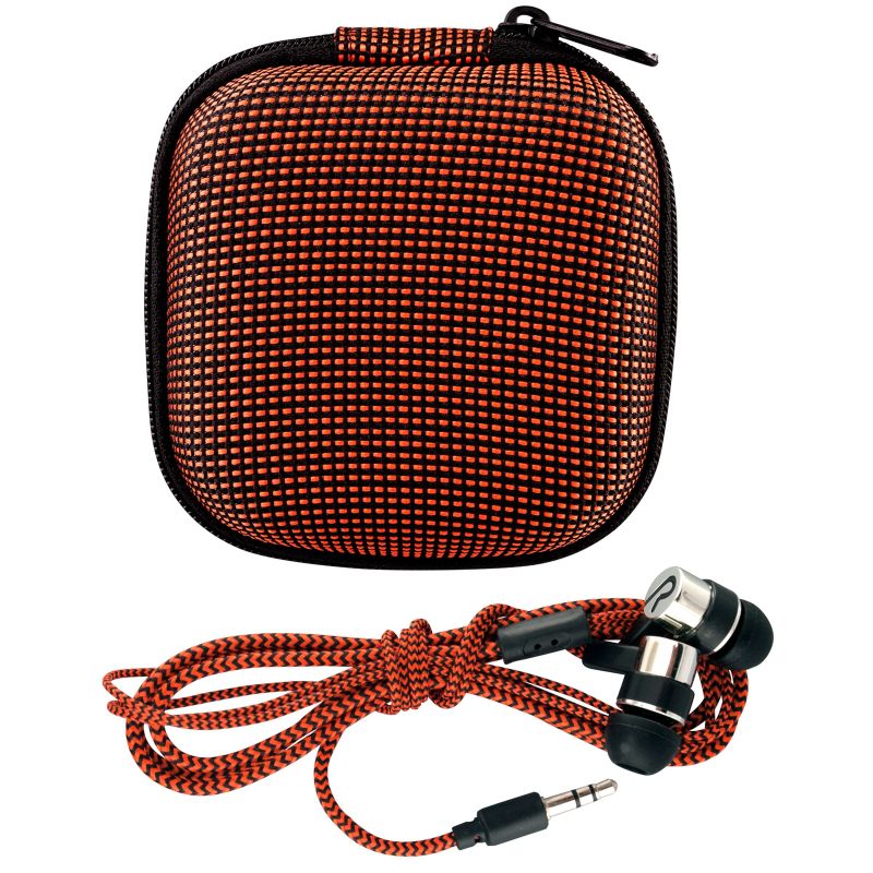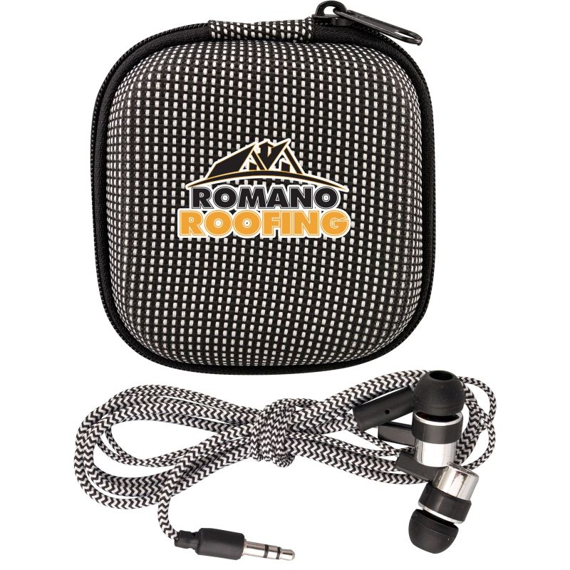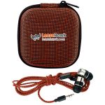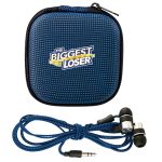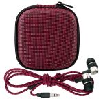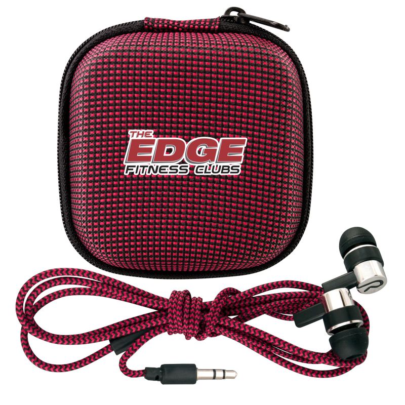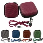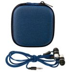 Molded textured case with zipper closure. Includes matching Braided Ear buds. Complies with Prop 65. 3.25″ L x 3.25″ H x 1.25″ W
