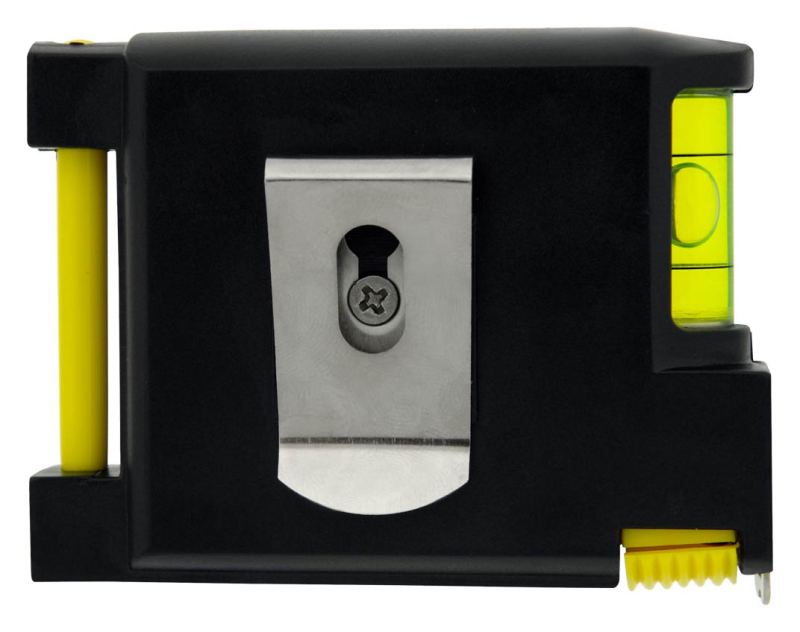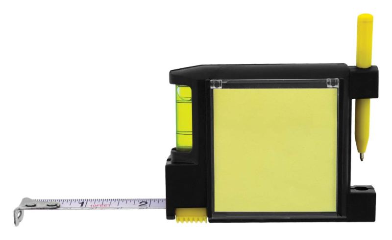It’s made of ABS material, has a size of 3″ x 2 3/8″, measures up to 10 feet, comes in black, and features a level, sticky notepad, yellow plastic pen, and belt clip. This has both standard and metric measurements. Complies with Prop 65. 3″ W x 2 3/8″ H