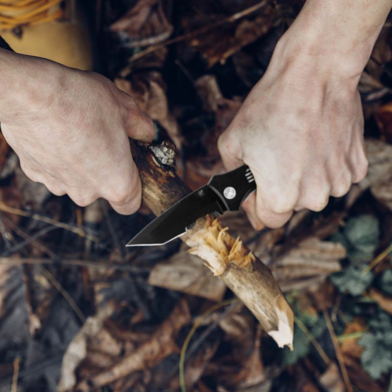 It’s made of 420 silver stainless steel, measures 5″, comes in black, and features a partially serrated blade with a heavy-duty comfort grip. This comes with a metal handle with belt cutter and a glass breaker tip, and features its own black pouch. Complies with Prop 65. 8″ L