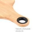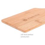 A sturdy cutting board made of sustainable bamboo. A perfectly-sized handle for a comfortable grip. The board is 3/8″ thick. The silicone rim protects the wood when storing. Large imprint area is great for branding. Bamboo products have natural anti-microbial properties. The color/texture of the engraving will vary from piece to piece due to the nature of the material. Complies with Prop 65. 14″ L x 7″ W x 3/8″ D
