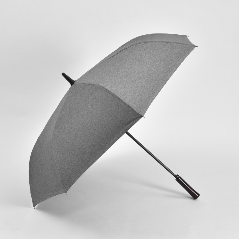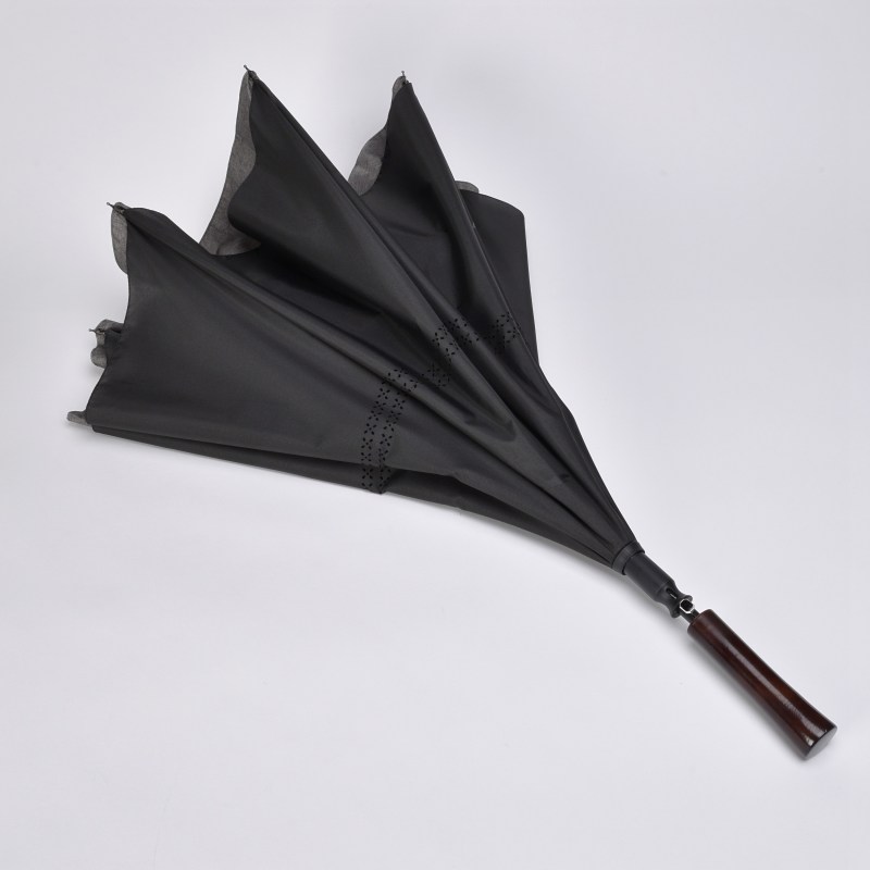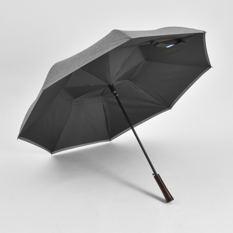 Revolutionary design as seen on TV. This inverted design closes away from you, making it super simple to get in and out of your car without getting wet. This auto open umbrella has a double canopy that comes in our new heather grey color and has a sleek cherry wood handle. Powered by our Patented RainAlertzâ„¢ app- This umbrella will tell you when it’s going to rain… Really! 46″ Diameter