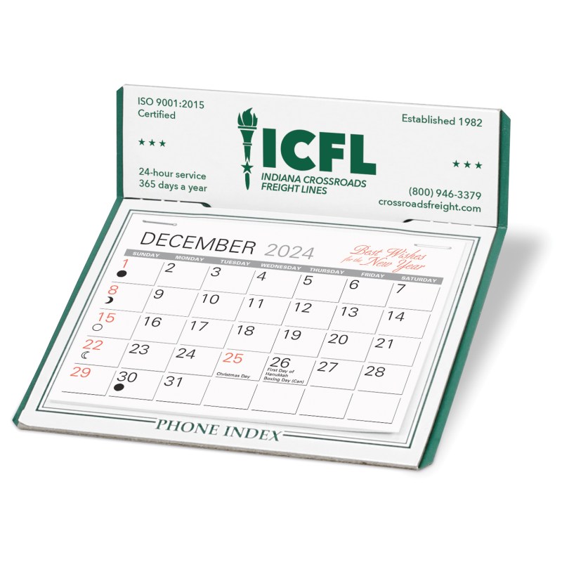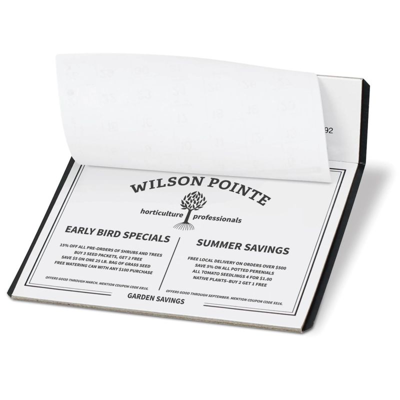 BEST SELLER! Start customizing with three imprint areas, top front, under the datepad, and the back, all at no extra charge. Over 24 sq. inches of ad space, perfect for branch offices, dealer info, new products or even a coupon. Stock or custom, either way your customers will be able to have all the information they need at their fingertips. White with 5 trim & matching imprint colors. Mailing envelopes included, not inserted. 5 1/4″ W x 5 1/2″ H