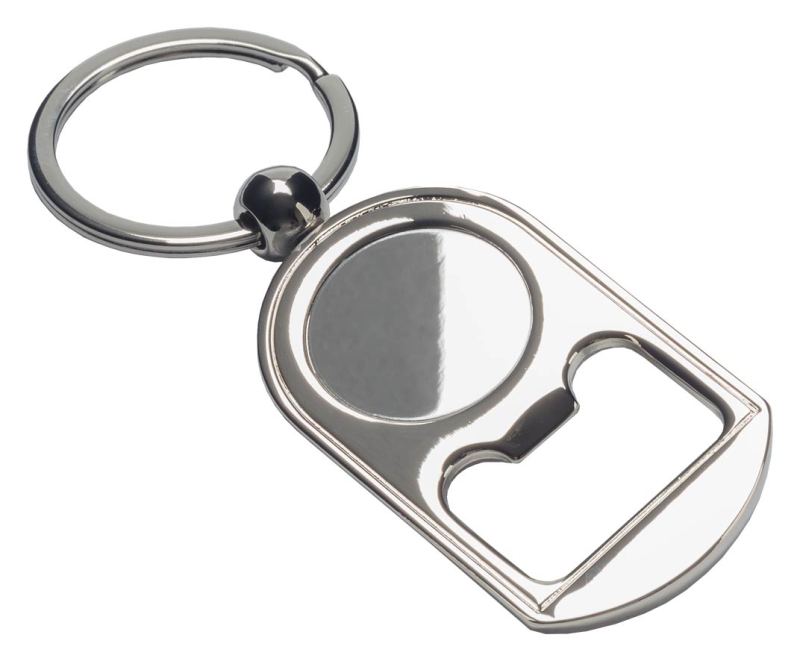 This 3 3/4″ x 1 15/16″ polished chrome opener has an open pull tab-inspired design to help get the best of all kinds of bottle caps. The wide split ring is ready to attach to your purse, backpack or favorite keyring. Includes a gift box. Epoxy Dome not included in 24hr service. Epoxy Dome will require 3 day production. 3rd Imprint Option: (Vinyl Insert / Epoxy Dome): 0.89″ Diam. 24hr production is not available for direct imprinting. Complies with Prop 65. 3 3/4″ W x 1 15/16″ H