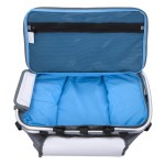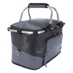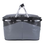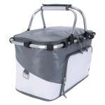The Viking Collection® Tarpaulin Picnic Tote features heat-sealed PEVA lining, dual zipper closure, large interior mesh pocket, front zipper storage pocket, aluminum frame, and handles, with an attached bottle opener and collapsible for easy storage. 9.5″ Diameter x 10.75″ H