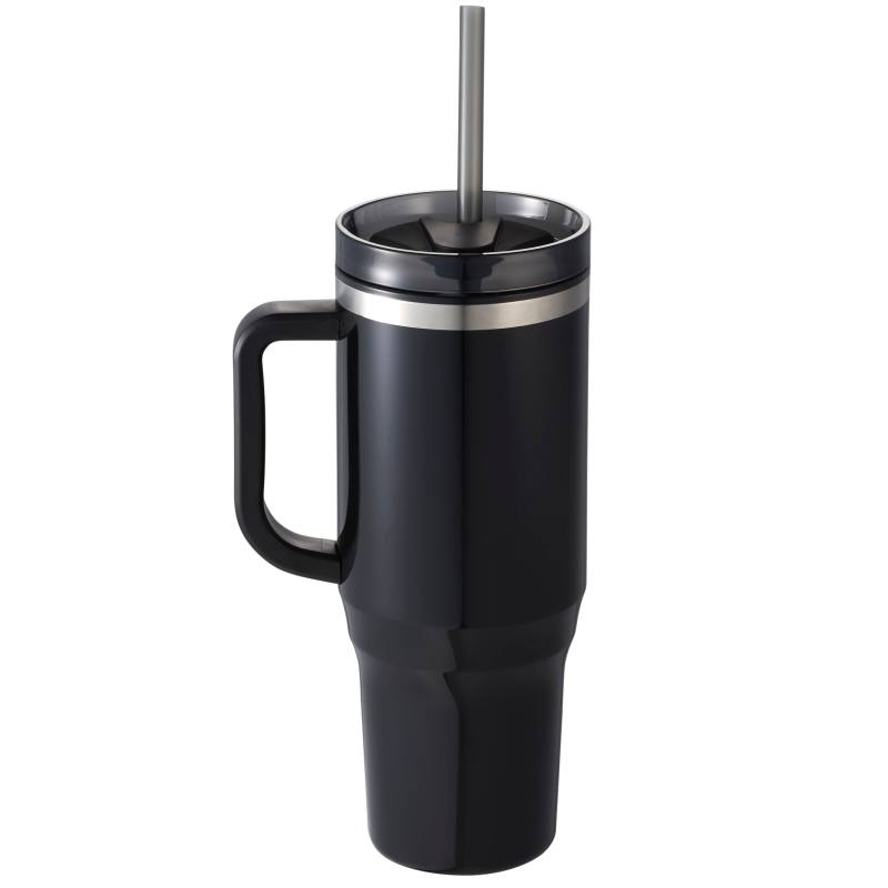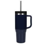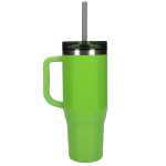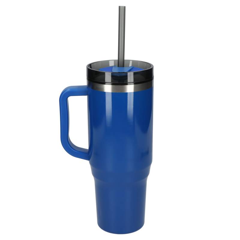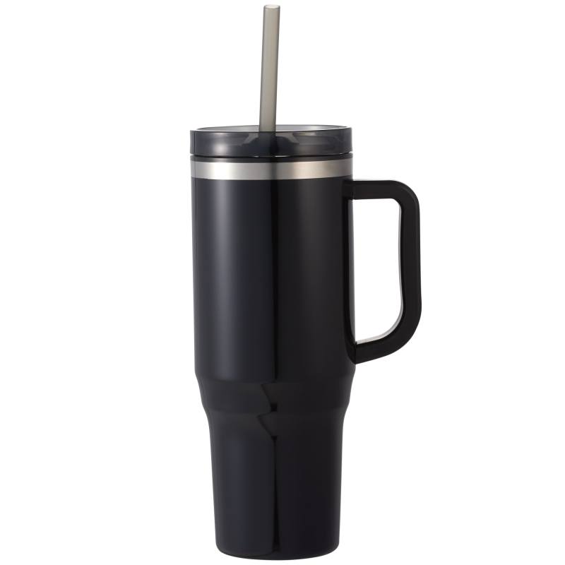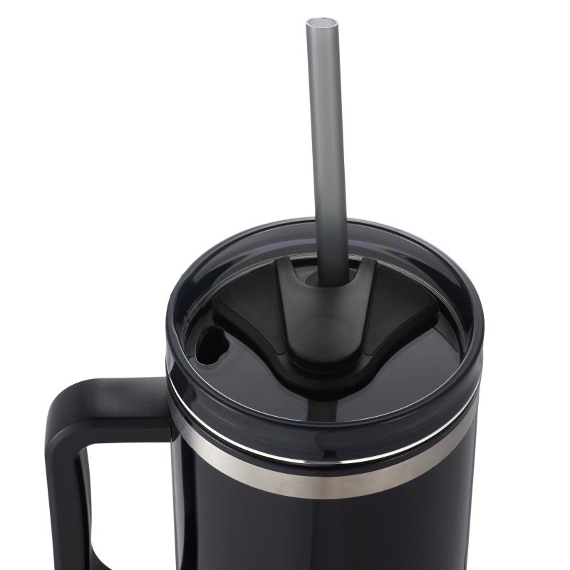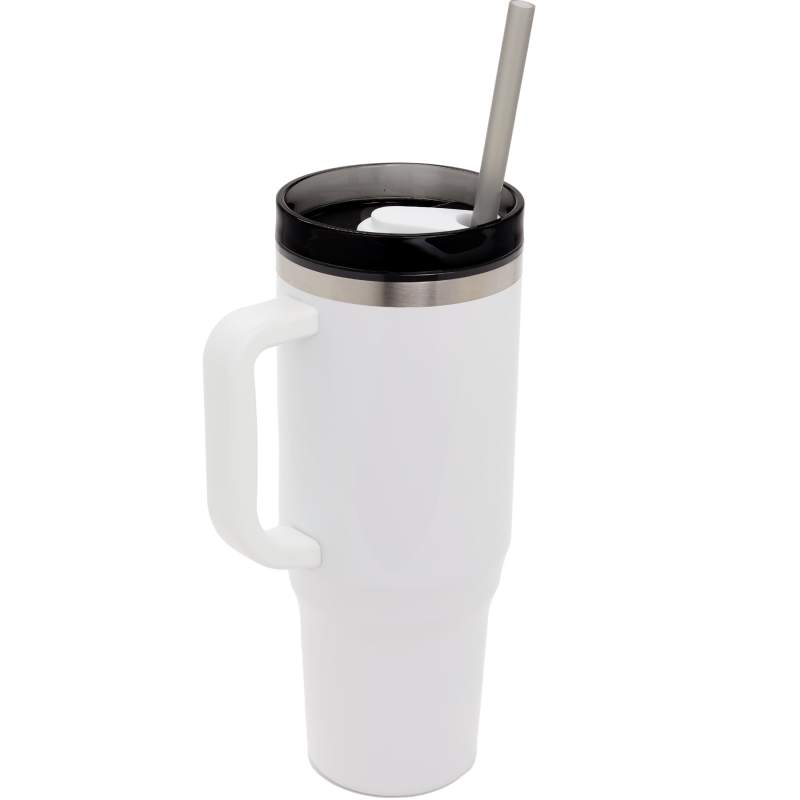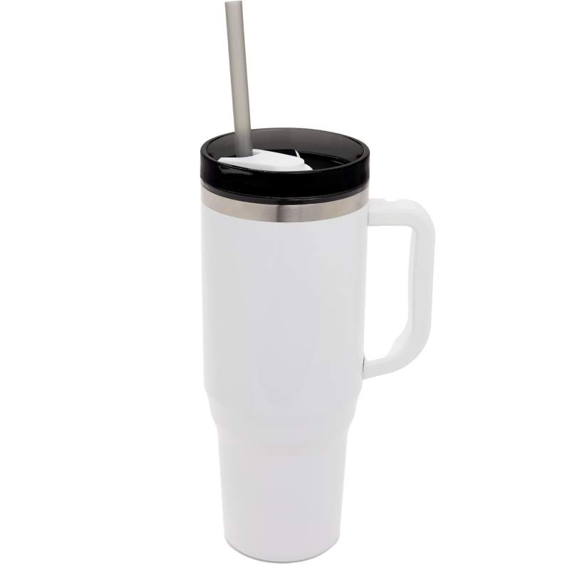 The Thor 40 oz Eco-Friendly Straw Tumbler features durable double-wall construction to keep your beverages hot or cold in any environment. Food-grade recycled straw included for easy reuse daily. The Thor has a 40 oz capacity for fewer refills and features a slim base that fits into most cupholders, comfortable carry handle, and splash-proof press-on lid with two openings and a swivel closure, friendly to both Sippers and Chuggers! Hand-wash only. 0.00″ D x 5.43″ W x 10.31″ H