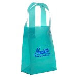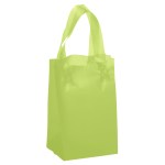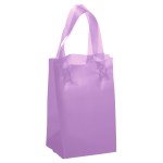 Colorful frosted hi-density plastic bags feature fused loop handles and a cardboard bottom insert. 5″ W x 3″ D x 8″ H