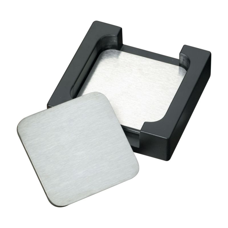 Stainless steel coaster set- A stylish addition to any table top- 6 stainless steel coasters with non-slip foam bottom- Stylish black caddy. 5.375″ W x 5.375″ H