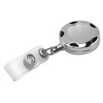 32″ Chrome metal sport retractable badge reel. The cord is 30″ long and the reel is made of high quality stainless steel. It comes with a metal slip clip backing. Complies with CPSIA, Prop 65. 1 1/4″ Diameter