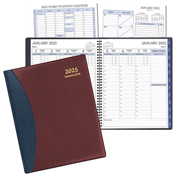Helps organize and prioritize annual, monthly and weekly planning. Wire Bound pages 12 Months: Jan. thru Dec. Two-page yearly planner. Two page monthly planner. Timed 7:00 am. to 7:00 pm. U.S. and Canadian holidays. Forward planning section. Annual objective section. Area for special projects and monthly objectives. One week per opening. Full Saturday and Sunday. Two month reference. Weekly summary. Monthly indexing. Julian dating. 8 1/2″ W x 11″ H