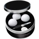 Includes your choice of three Titleist Pro V1 or Pro V1x custom golf ballsPersonalized tin lid with your company logoIncludes one Titleist Sharpie Mini (Black) and five Titleist tees