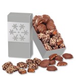 Your customers and employees will be thrilled with this delicious gift! Rich, mouthwatering Caramel Pecan Clusters made with creamy caramel, full-flavored Southern pecans, and premium chocolate come packed with our signature English Butter Toffee. Our toffee is made the old-fashioned way with plenty of dairy-fresh Wisconsin butter for a flavor that’s almost impossible to find anymore. All wrapped up into an elegant silver gift box with your logo and a die-cut snowflake wrap. Complies with CPSIA, FDA, Prop 65. 7.375″ L x 3.875″ W x 2.25″ H