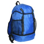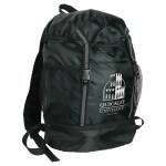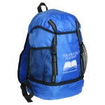 Trail Loop Drawstring Backpack, made of 210D polyester, features adjustable shoulder-straps, front pocket, side mesh bottle pockets, zippered bottom storage compartment and covered top access with drawstring closure. Complies with Prop 65. 14.75″ L x 6.75″ W x 20″ H