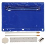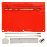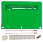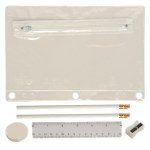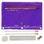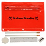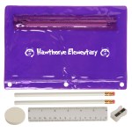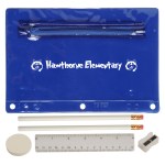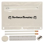 Includes 2 White Jo-Bee Miser Round Pencils without imprint, 1 White Jo-Bee Round Eraser without imprint. 1 White Jo-Bee 6″ Plastic Ruler without imprint, 1 White pencil sharpener without imprint. 6 1/4″ W x 9 1/4″ H