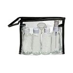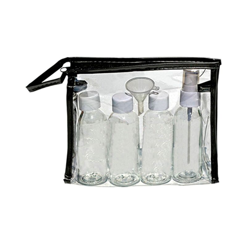 Breeze TSA Friendly Travel Bottles in Case. Kit includes three 80ml refillable bottles. One 80ml refillable spray bottle. One mini-funnel. Clear vinyl case with zipper closure. 7 1/2 x 7 1/8. 7.5″ W x 7.125″ H x 0.01″ D