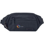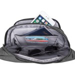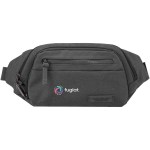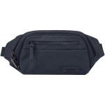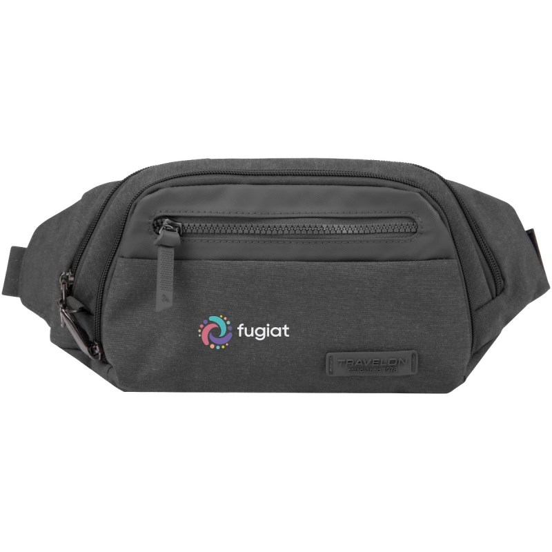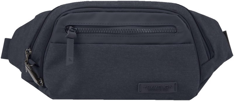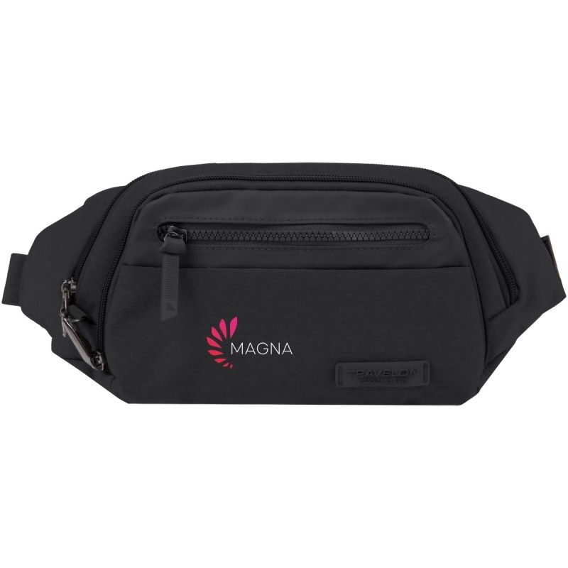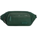 Adjustable waist strap fits most waists sizes up to 56″. Rear compartment organizer has a zippered pocket. Quick access front zippered pocket and rear slip pocket. 1.5 cubic liter capacity. 5-Point Anti-Theft security system: slash-resistant mesh, slash-resistant strap, RFID blocking organizer, locking compartments, lock-down strap. Patented. Tethered key clip LED light. Roomy front zippered compartment. 4″ D x 12″ W x 7″ H