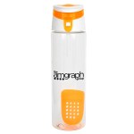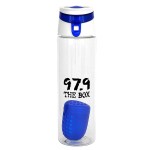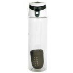 Introducing our 24 oz. refillable water bottle featuring a unique floating infuser! Enjoy infused water on-the-go with this convenient bottle that holds 20-22 oz. of liquid when filled with your favorite fruits. The screw-on flip-top lid includes an easy-carry pop-up handle for added convenience. Rest assured, this bottle is BPA free, but we do not recommend using it in the dishwasher or microwave for optimal longevity. Stay hydrated in style with our versatile and eco-friendly water bottle! Complies with Prop 65. 2.75″ D x 9.75″ H