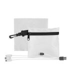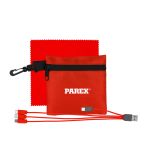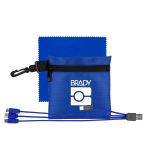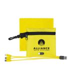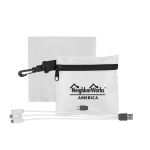 Introducing our stylish Tech Pouch crafted with durable ripstop fabric. Complete with a vibrant 5 x 5 recycled PET cleaning cloth and a colorful 4-in-1 charging cable featuring multiple USB adapters. This innovative design is compatible with IOS devices, Micro USB, and Type C USB, all of which are patented. With both USB and Type C USB input options, this pouch is a must-have for tech-savvy individuals on the go. Complies with CE, Prop 65. 4″ L x 4″ H