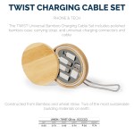 TWIST Universal Bamboo Charging Cable Set includes polished bamboo case, carrying strap, and universal charging connectors and cable. Constructed from Bamboo and wheat straw. Two of the most sustainable building materials on earth. 360-degree magnetic rotating cover. Packaged in a simple kraft paperboard box. Large laser engraving area for beautiful presentation of your client’s brand. Wide Compatibility—Suitable for power & data transfer. Includes: Micro-USB, USB Type C and 8-pin style. 3″ W x 3″ L x 0.5″ H