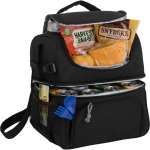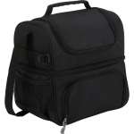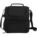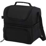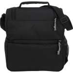 The Two Tier 12 Can Lunch Cooler keeps your items chilled and organized for easy access! The two-tiered design allows for separation of your items into separate compartments, no more digging around to get what you need! The top compartment is secured with a zippered flap that has a hinge-style opening, perfect for food and snacks, while the bottom compartment will easily fit your food storage containers or up to 12 cans. The cooler also features a mesh water bottle pocket on the side and an adjustable strap buckle so you can secure larger water bottles and tumblers. Carry this cooler using the sturdy, reinforced grab handle or the adjustable crossbody strap.This cooler is made using durable 600D recycled polyester. 7.65″ D x 10.50″ W x 10.50″ H