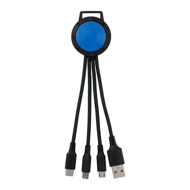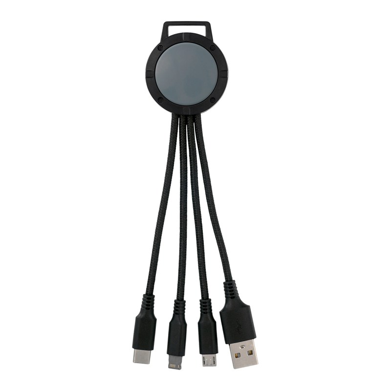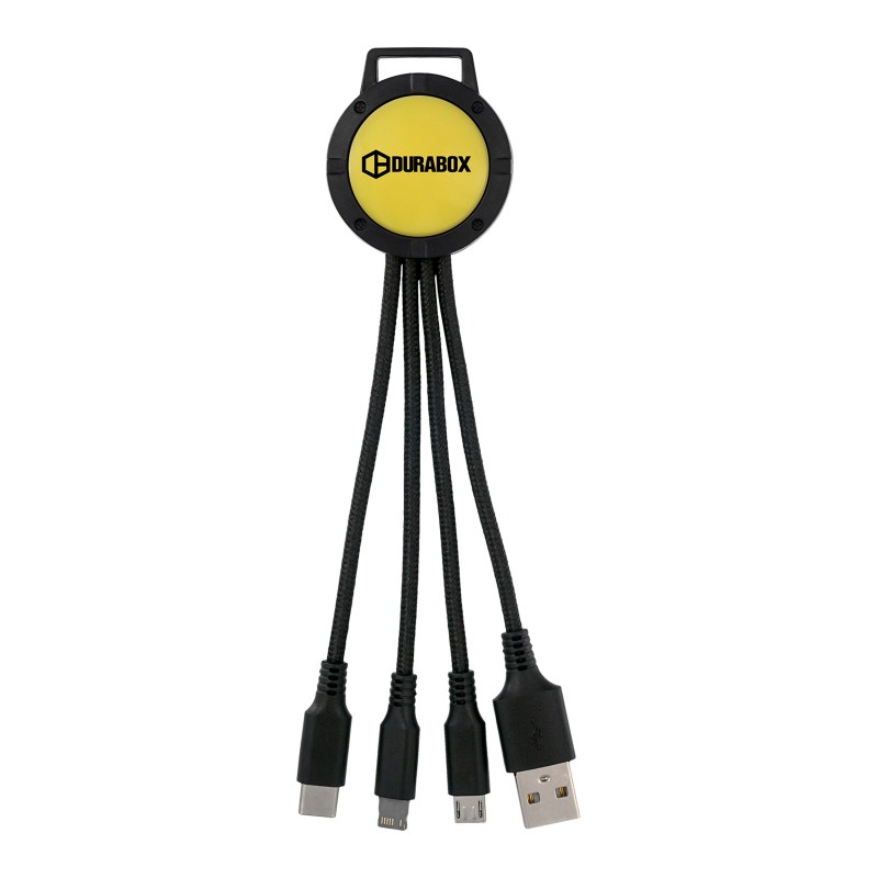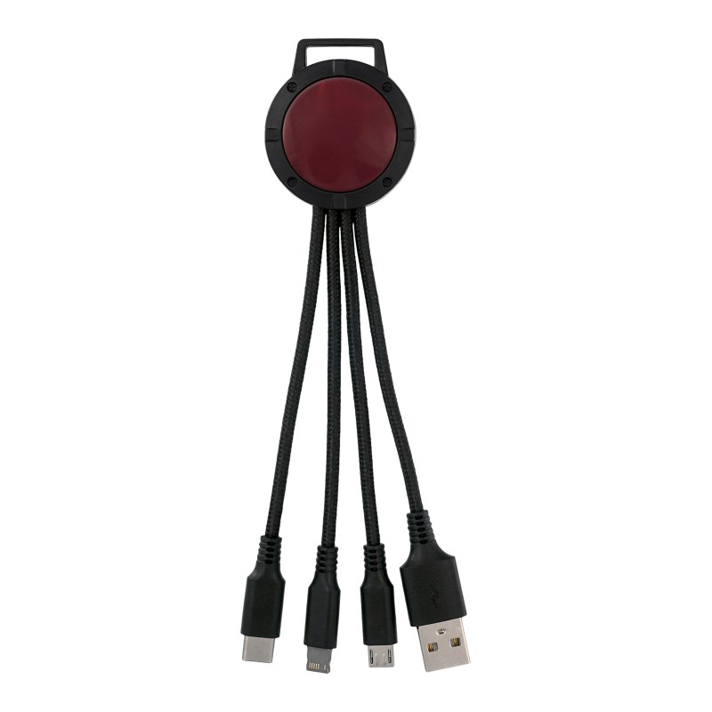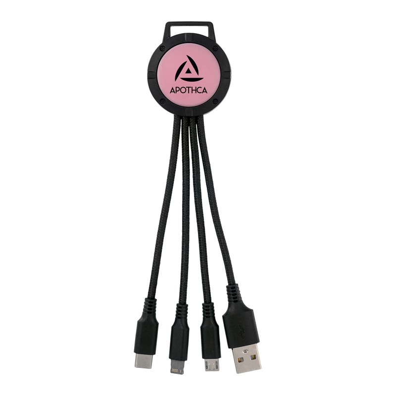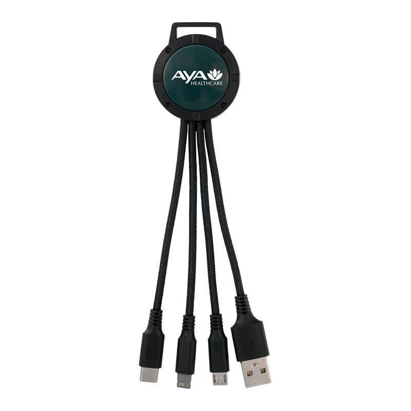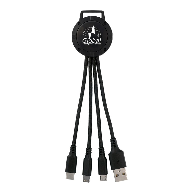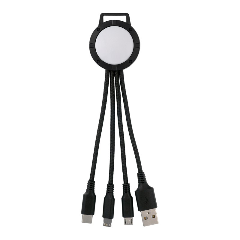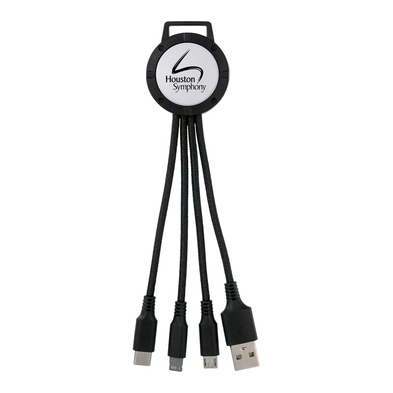 3-in-1 charging cable; Multiple USB adaptor; Patented. Compatible with 8-pin devices, Micro USB, Type C USB. No rush available for full color digital imprint. Complies with CE, Prop 65. 1.5″ L x 6.5″ H